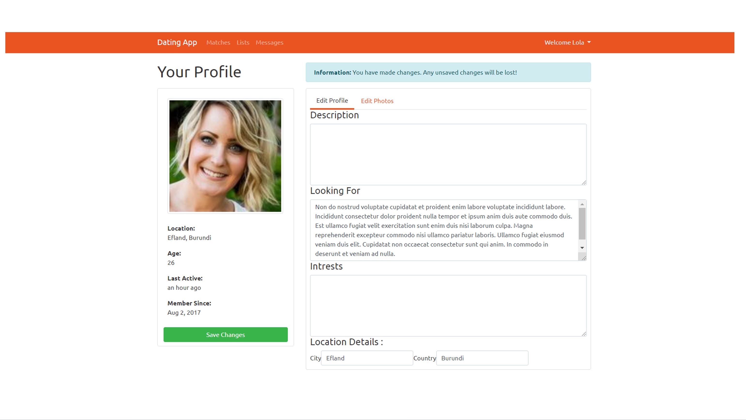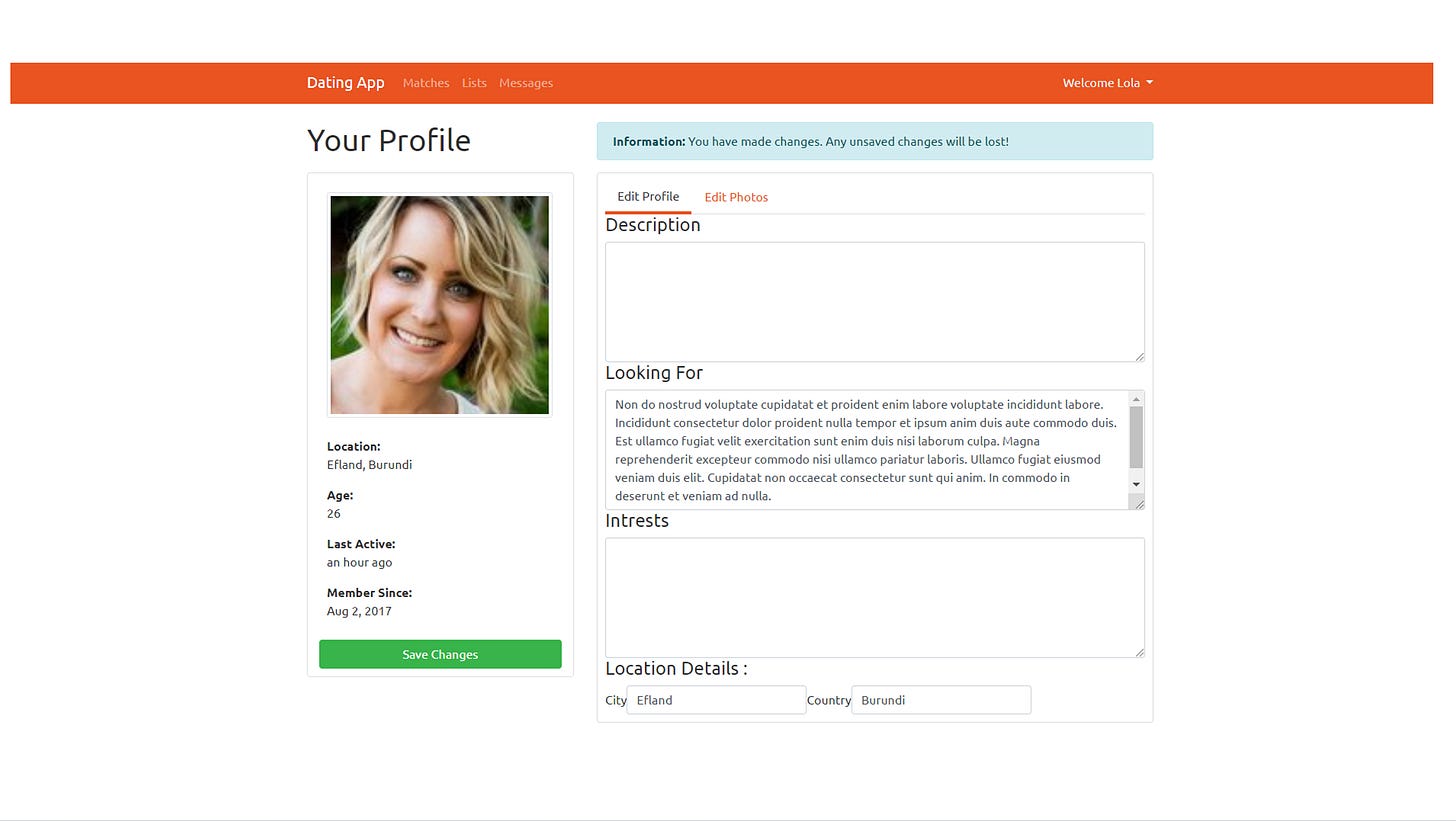 Dating App is a modern web application designed to help users find and connect with suitable matches. It provides a secure, interactive platform where users can create profiles, upload photos, send messages, and express interest through likes. The project demonstrates the full-stack development of a dynamic, data-driven application with strong emphasis on usability, scalability, and security.